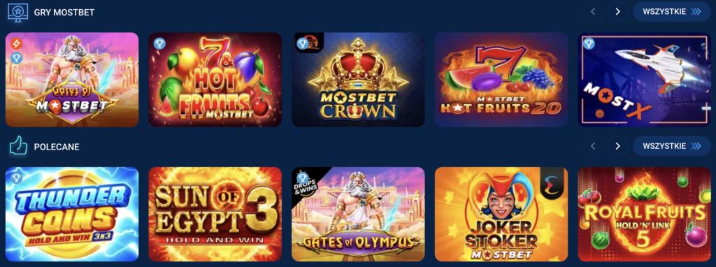 Automaty online to największa kategoria gier w Mostbet Casino. Gracze mają do wyboru setki tytułów o różnorodnej tematyce i mechanice – od klasycznych owocówek po sloty z zaawansowanymi funkcjami bonusowymi i progresywnymi jackpotami.